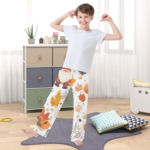 HOT ! Gnome Autumn Leaf Print Boys Long Pants Soft Trousers Elastic Waist Kids Lounge Bottoms with Pockets S-XL