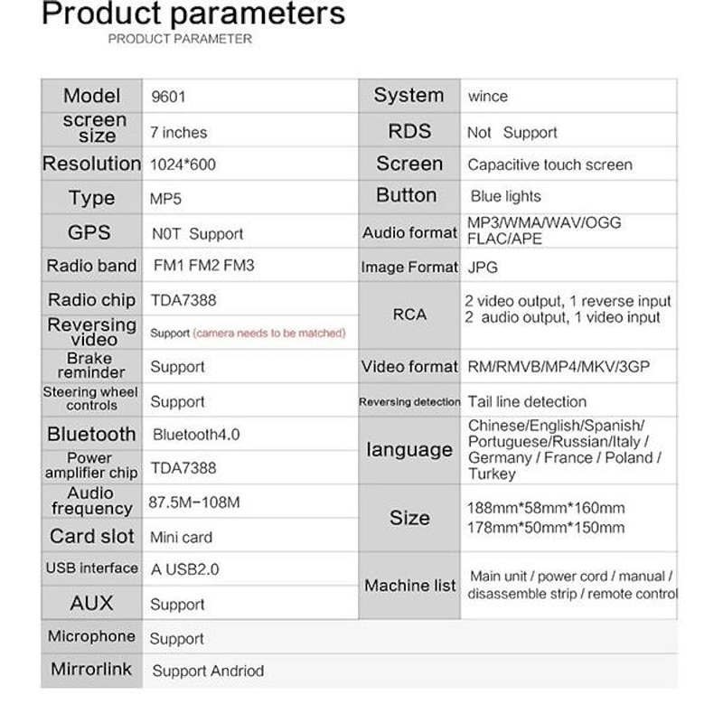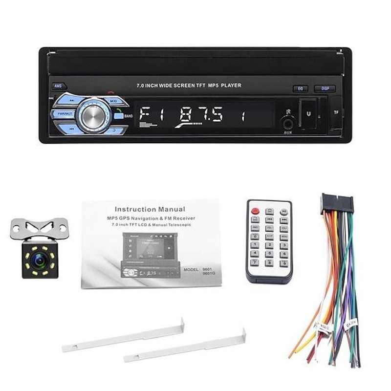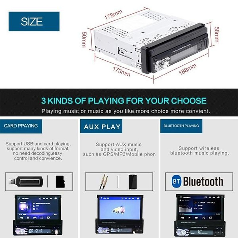 Highlights - Single Din Car Stereo with 12 led Backup Camera: This product is equipped with a single din touchscreen head unit that automatically displays the reversing visual when reversing. Additionally, it features a backup camera with a 170° wide-angle lens, night vision, high-definition, and IP68 waterproof features. - Mirror Link Function: The car multimedia player supports Android/iphone mirror link via USB cable (For Android 4.0-8.0, For iPhone 8 and below) allowing for the synchronization of the navigation interface of the phone to the car stereo interface. - Bluetooth & FM Radio: This single din car stereo has Bluetooth 4.0, which supports hands-free calls, phone book download, and Bluetooth music play. It also features a high-quality digital stereo FM radio with 18 presets, 87.5M-108M FM frequency, and automatic channel search. - Multifunction 1 din Autoradio: The 7-inch retractable HD screen needs to be pulled out manually. Additionally, it supports TF Card/U-disk and AUX audio input interfaces, which allows for the addition of MP3, cell phones, music players, and other audio inputs.