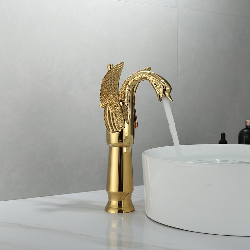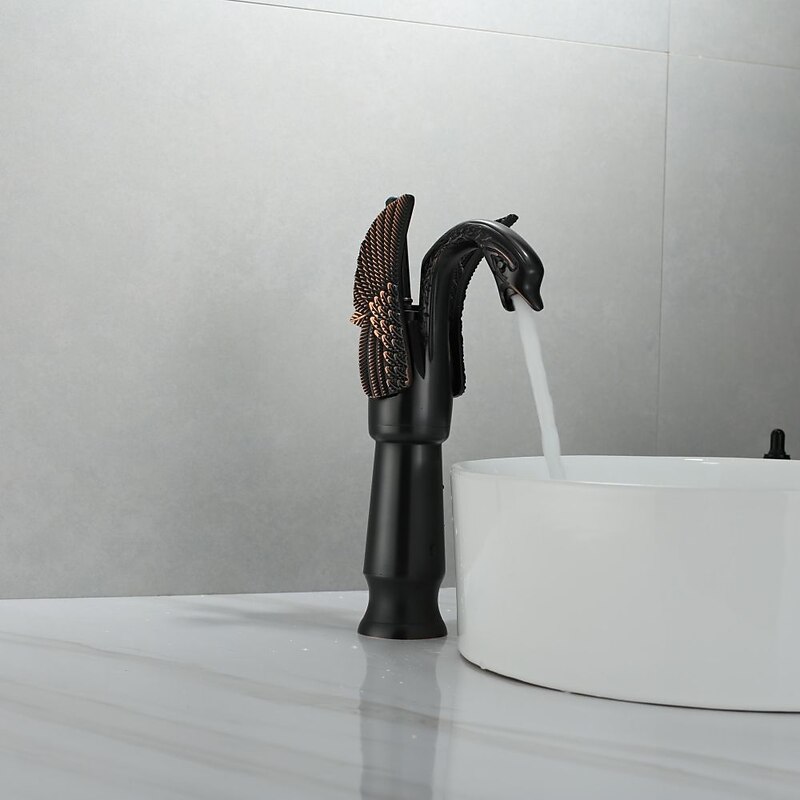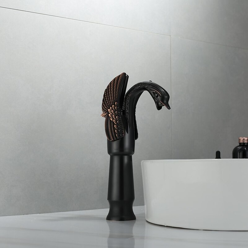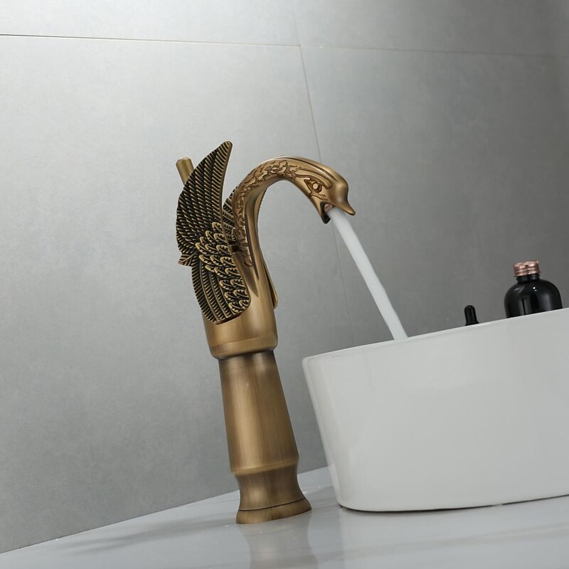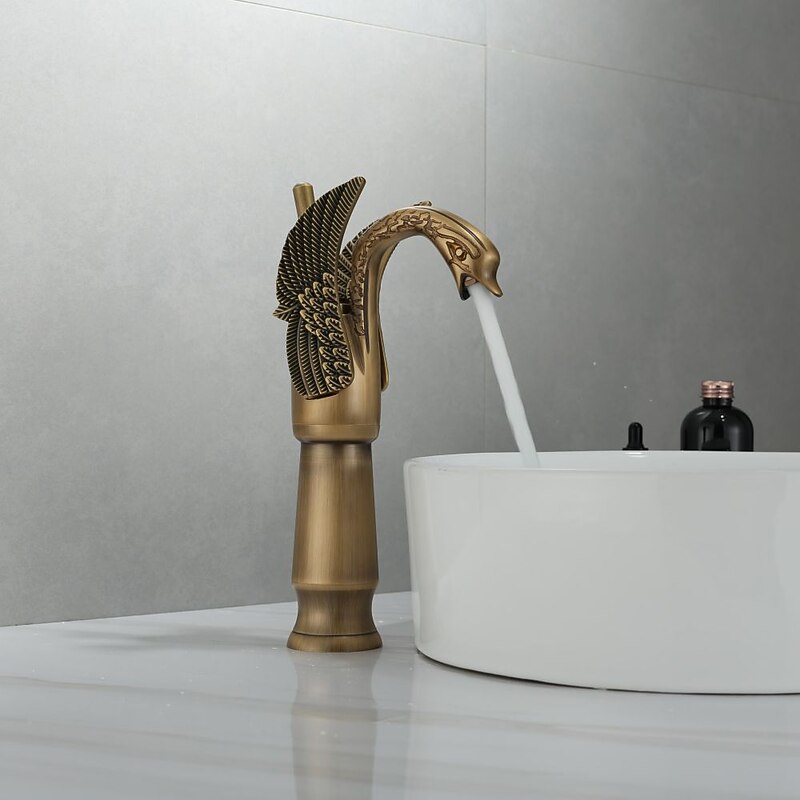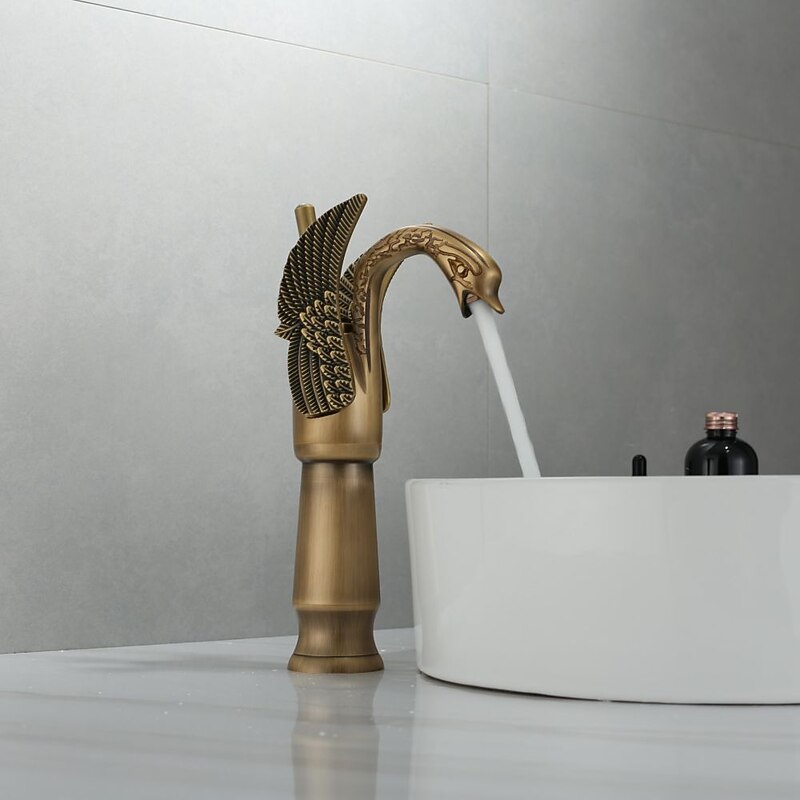 Antique Bathroom Sink Mixer Faucet, Washroom Basin Taps Brass Swan Shape Copper Electroplated Finish Vintage Style Single Handle One Hole Water Taps with Cold Hot Hose 1