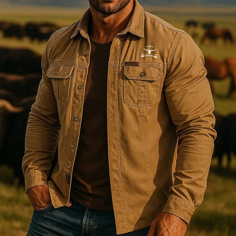 Men's Cow Print Work Shirt Western Shirt Cargo Shirt Long Sleeve Casual Tactical Sports Outdoor WorkWear Spring Fall Turndown Front Two Pockets Button Up Shirts Army Green Khaki 1