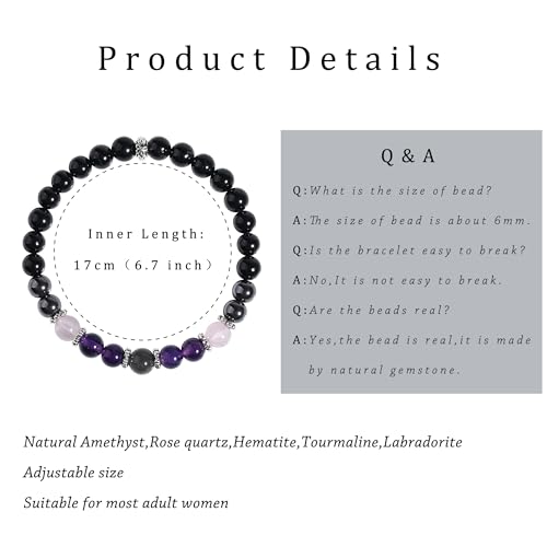 • Material: This bracelet is handmade of natural healing crystal, they are black tourmaline, hematite, rose quartz, amethyst, labradorite, all are natural stones. Those stones are good for people to wear daily, it's believed helps for empath protection, emotional healing, self love, transformation etc.
