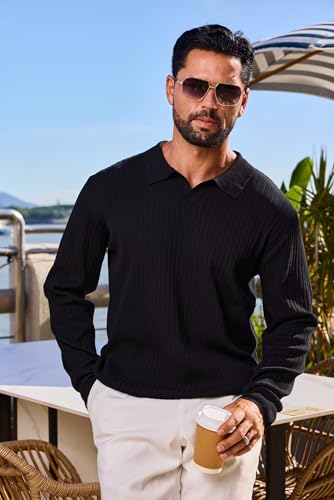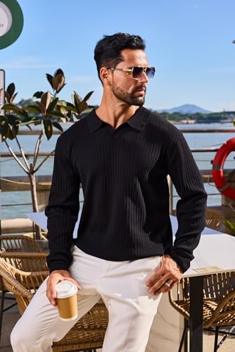 Mens Long Sleeve Knit Polo Shirt Lightweight Ribbed Polos Sweater Fall Winter Thermal Pullover Shirts with Collar 1