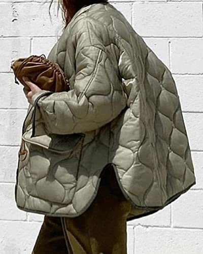 HOT ! RINTONIX Womens Long Sleeve Button Down Thermal Winter Quilted Jacket Asymmetric Loose Padded Barn Jacket Outerwear