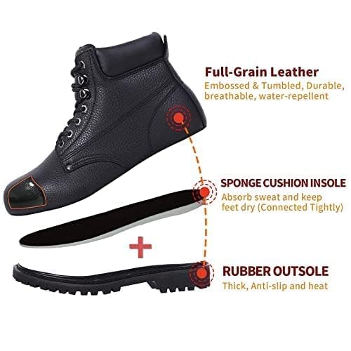 Sole material: RubberShaft height: AnkleShaft circumference: 10 InchesPlatform height: 1.25✅[STEEL-TOE BOOTS]: Resistant to slip, oil, heat and chemicals like acid and alkali, also electrical hazard (18KV/1mA means No leakage or leakage does not exceed 1 mA at 18KV within 1 minute). Safe, Tough and Durable, help you conquer challenging grounds like mud and snow.✅[PREMIUM QUALITY]: Made with high-quality water-resistant Tumbled then Embossed Full Grain Leather and lined with moisture-absorbing performance fabric, keep your feet comfortable and dry all day. Non-marking rubber soles and enduring Genuine Goodyear Welt provide the strongest construction, ensure the work shoes are durable, steady and strong✅[COMFORTABLE TO WEAR]: Soft Leather and Sponge Pillow Cushion Insole provides maximum comfort to your feet during long stand hours. Steel shank reduces pressure when climbing up and down stairs/ladders. Never want to take off boots while working.✅[SIZE]: Steel toe, non-slip boots protect your whole feet with guaranteed safety. Heel height 1.3” (3.3cm), Shaft height 5.31” (13.5cm). Available colors Black, Wheat and Brown. Available Sizes US 7-17 for MEN, equals US 8.5 - 18.5 for WOMEN.✅[MORE Wide Width OPTIONS]: We specially offer wide width safety shoes to give you more choices. Please refer to our size chart to choose the most suitable size. If you have any questions, our professional after-sales team will give you professional answers within 12H. Perfect for everyday use. first-class materials and excellent craftsmanship ensure long-lasting durability.