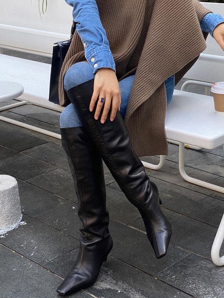 Women Black Knee High Boots Square Toe Low Heel Tall Boots 6