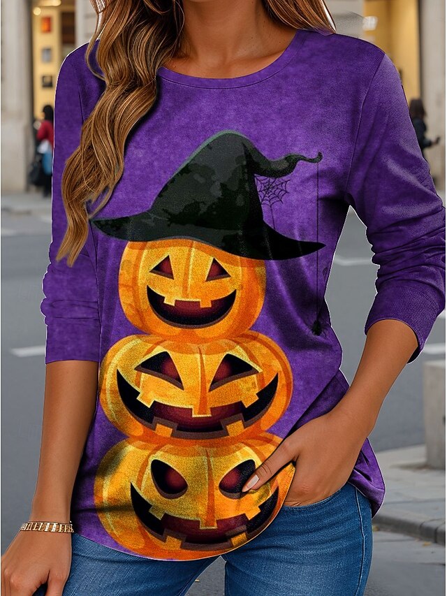 More information about Halloween Women's T shirt Pumpkin Crew Neck Long Sleeve Tunic Graphic Vintage Stylish Classic Regular Tops Daily Print Blue Purple Green Khaki Spring Fall
