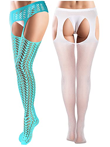 6 Pairs Women Fishnet Thigh High Stockings Garter Belts and Suspender Pantyhose Stockings for Halloween (Classic, White, Grey, Light Blue, Carmine, Fluorescent Green, Black,Medium-Large) 2