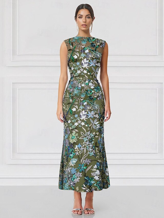 Mermaid / Trumpet Cocktail Dresses Embroidered Elegant Formal Wedding Guest Floor Length Sleeveless High Neck Sequined with Glitter 1