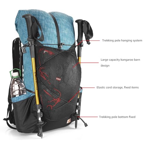 • 56L (40+16) Large Capacity: Includes main compartment, two hip belt side pockets, external large-capacity kangaroo compartment, diagonal side pockets, you can put tents, blankets, cooking equipment and other accessories into this backpack , the internal layout of the backpack is clear and easy to classify, and an external mounting system for hiking poles is designed to make your hiking more convenient.