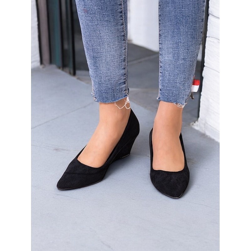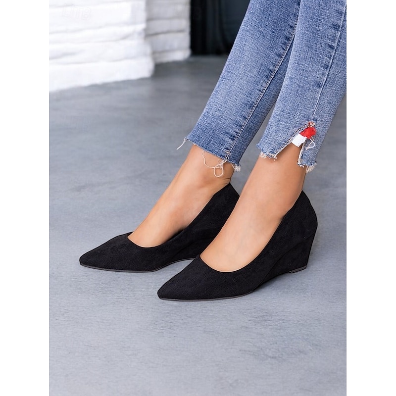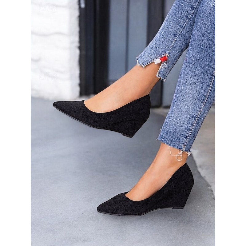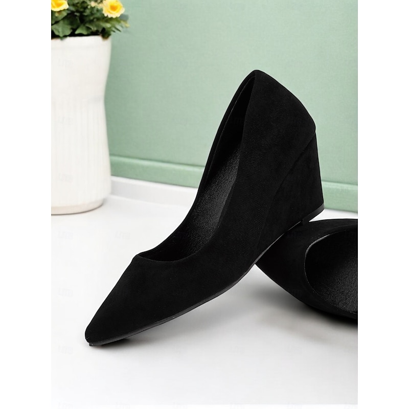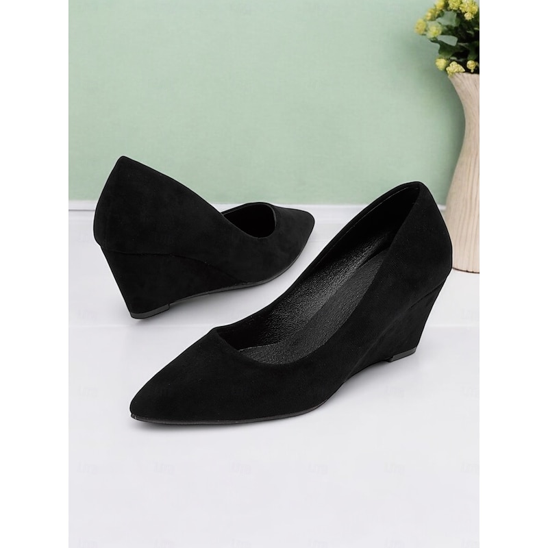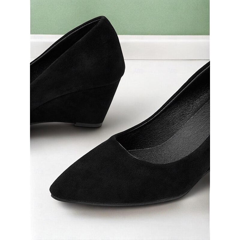 HOT ! Women's Black Faux Suede Pointed Toe Wedge Pumps - Elegant and Comfortable Shoes for Office Wear and Formal Events