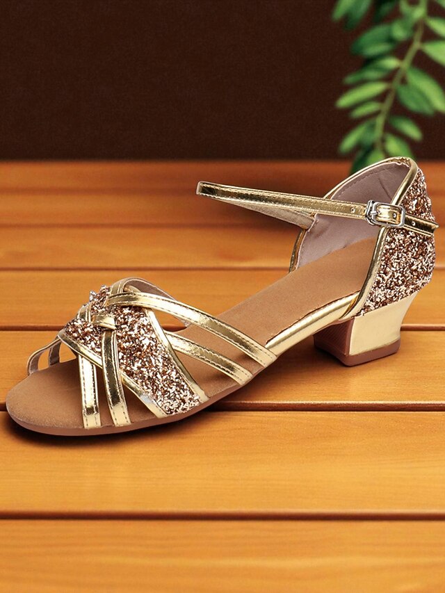 More information about Women's Gold Glitter Latin Dance Shoes with Low Block Heel, Ankle Strap, Open Toe - Professional Ballroom Performance Footwear for Competitions and Practice