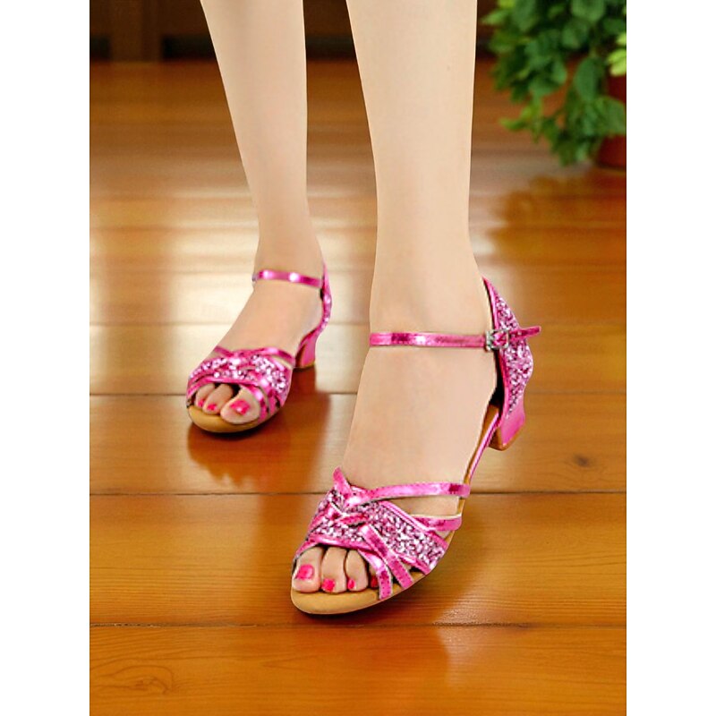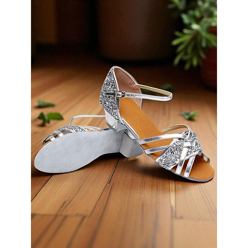 HOT ! Women's Gold Glitter Latin Dance Shoes with Low Block Heel, Ankle Strap, Open Toe - Professional Ballroom Performance Footwear for Competitions and Practice