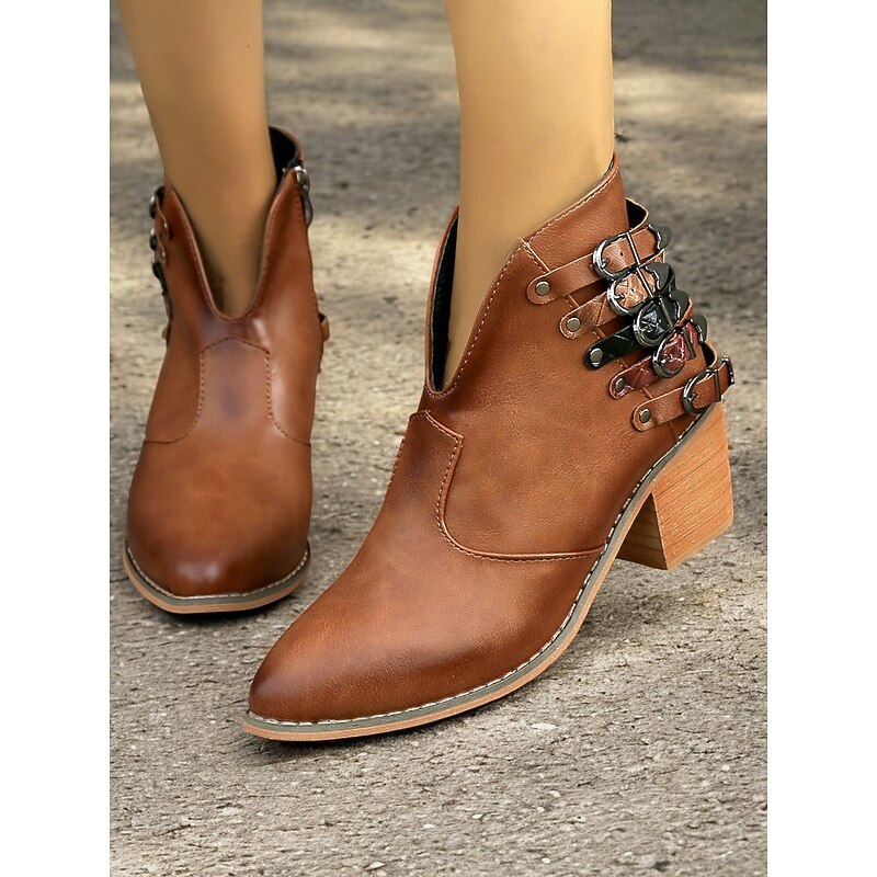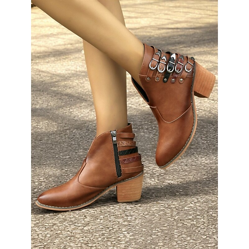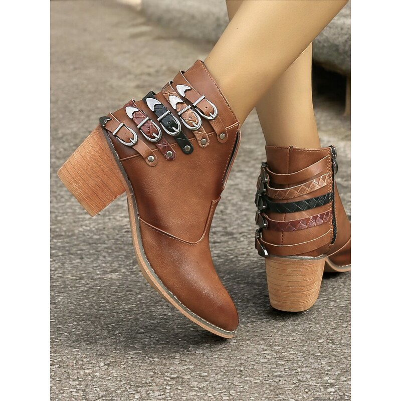Women's Brown Ankle Boots with Multi-Buckle Detail, Block Heel, and Western Style - Perfect for Casual Outings and Everyday Wear