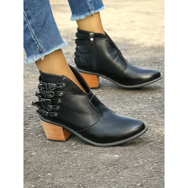 The standout design includes a unique multi-buckle detail that adds an edgy, modern twist to the Western-inspired style. The round toe shape and chunky heel provide a comfortable, stable fit, ideal for daily wear throughout the spring, fall, and winter seasons.