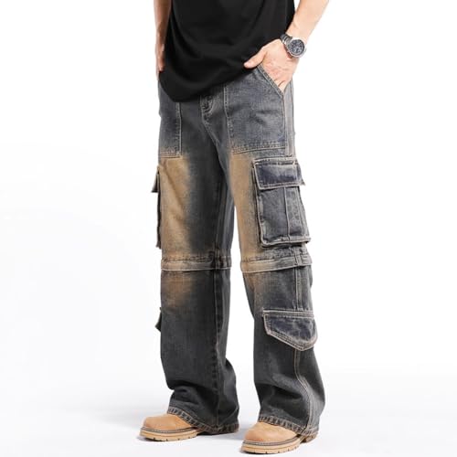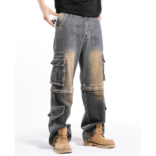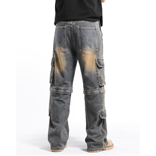 HOT ! Men's Hip Pop Cargo Denim Pants Casual Straight Leg Loose Fit Detachable Jeans
