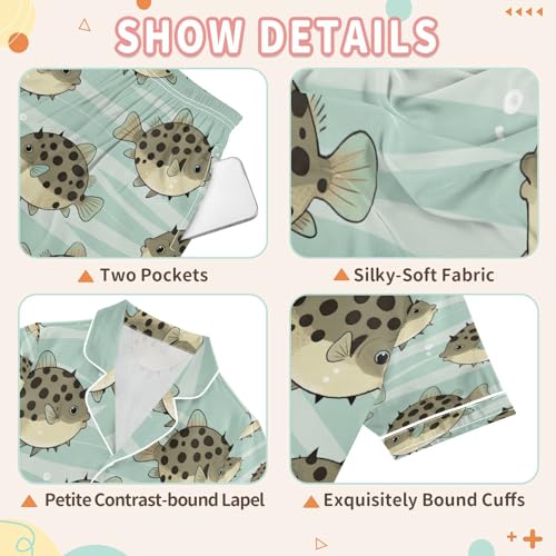 Satin Pajama Sets Short Sleeve Fish Pattern Pufferfish Button Down Silky Nightwear 2 Piece PJS 5-14Y 6