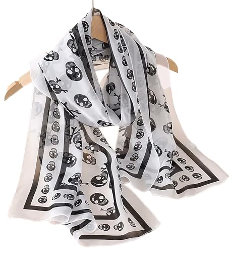 Mazeology Skull Scarf Soft Silky Poly Chiffon 59” Long Scarf Gothic Pirate Black/White 19” Wide Stripe Border for Women/Men Trendy Punk Accessory 5