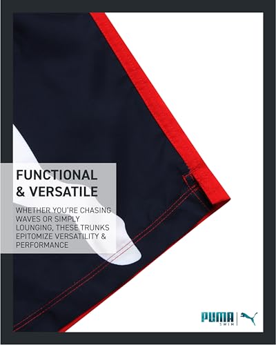 • Quick Dry Performance: Dive into aquatic escapades with unwavering confidence in these meticulously crafted PUMA Men's Bathing Suit Trunks; Engineered with state-of-the-art quick-dry technology, these trunks ensure rapid moisture evaporation, guaranteeing you remain comfortably dry both in and out of the water; Bid farewell to the discomfort of soggy swimwear and revel in the freedom to enjoy every moment of your aquatic adventures without hesitation