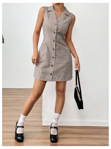 HOT ! MakeMeChic Women's Plaid Gingham Lapel Button Down Short Dresses Sleeveless A Line Shirt Dress with Pocket