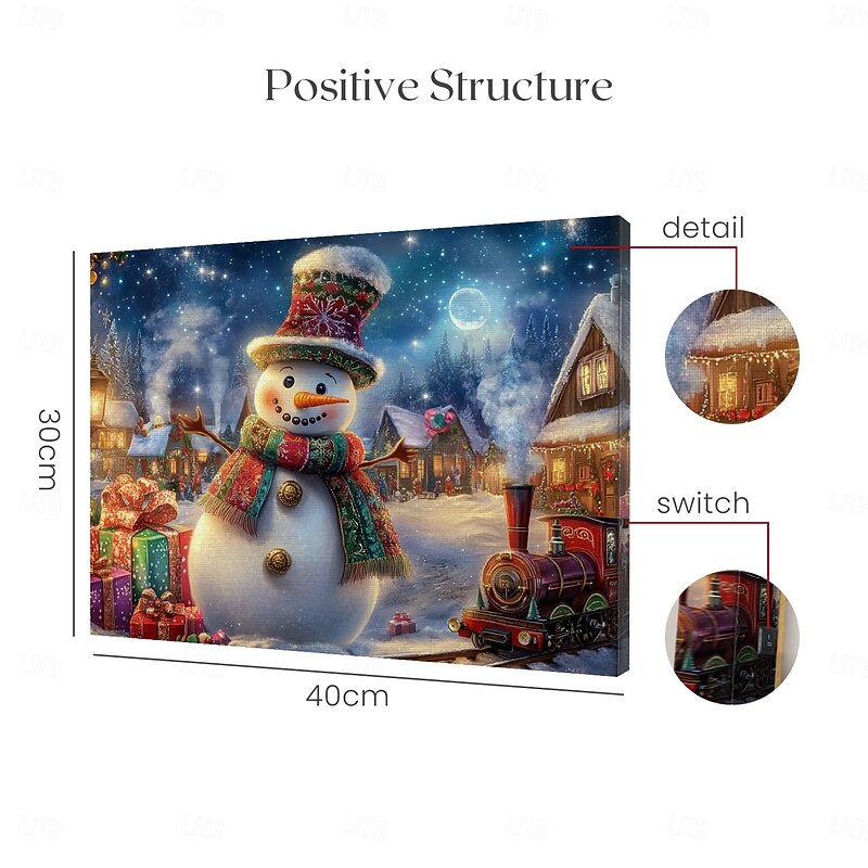 : Crafted from durable nonwoven and polyester materials, this Christmas Snowman LED Canvas Wall Art showcases a high-quality canvas texture that enhances the vibrant colors and intricate design details.