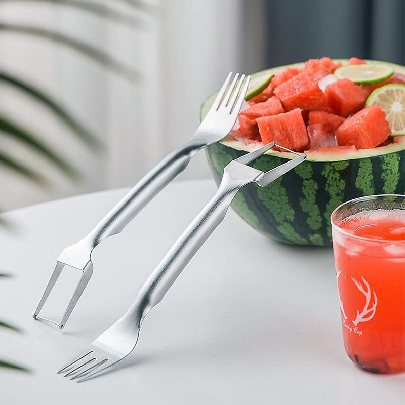 HOT ! 2-in-1 Watermelon Fork Watermelon Slicer Cutter Dual Head Stainless Steel Fruit Cutter Carving Tool for Home Party Family Camping