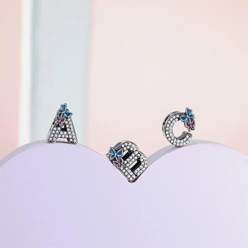 S925 Sterling Silver A~Z Letters Charms with 5A Cubic Zircon Stones, Butterfly Alphabet Beads fit Pandora European Bracelets Gift Options 5