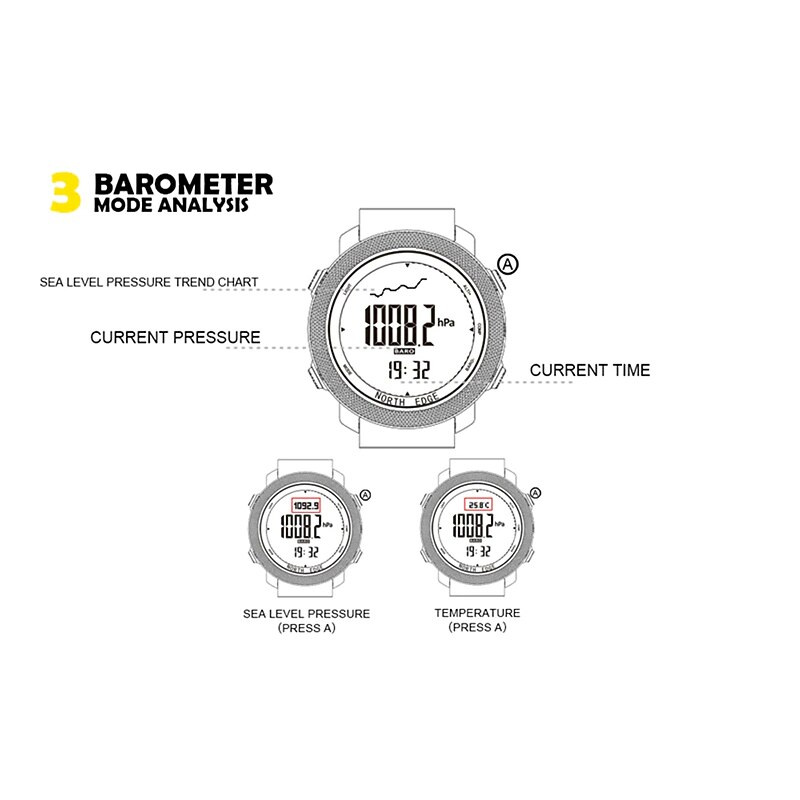 - It boasts features such as a compass, altimeter, barometer, thermometer, weather forecast, world time, dual time, pedometer, calorie, distance record, 2 sets of alarm, countdown timer, stopwatch, and an EL backlight.