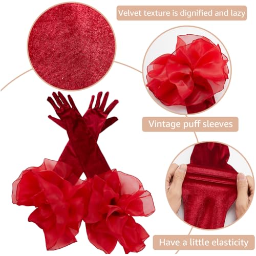 Dark Red Opera Party Gloves Long Vintage Soft Satin Velvet Costume Formal with Polyester Ruffle Tulle Cuff Elbow Length Arm Sleeves Glove for Women Prom Banquet Dancing Dress Gift 6