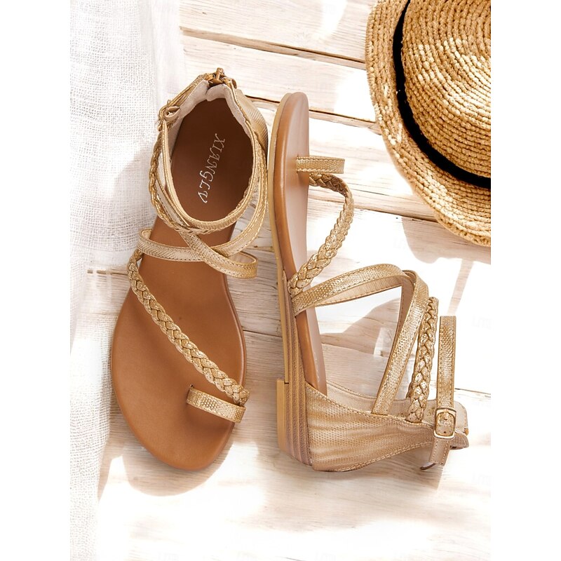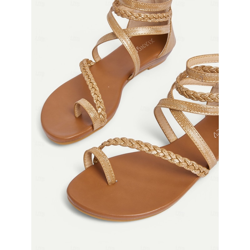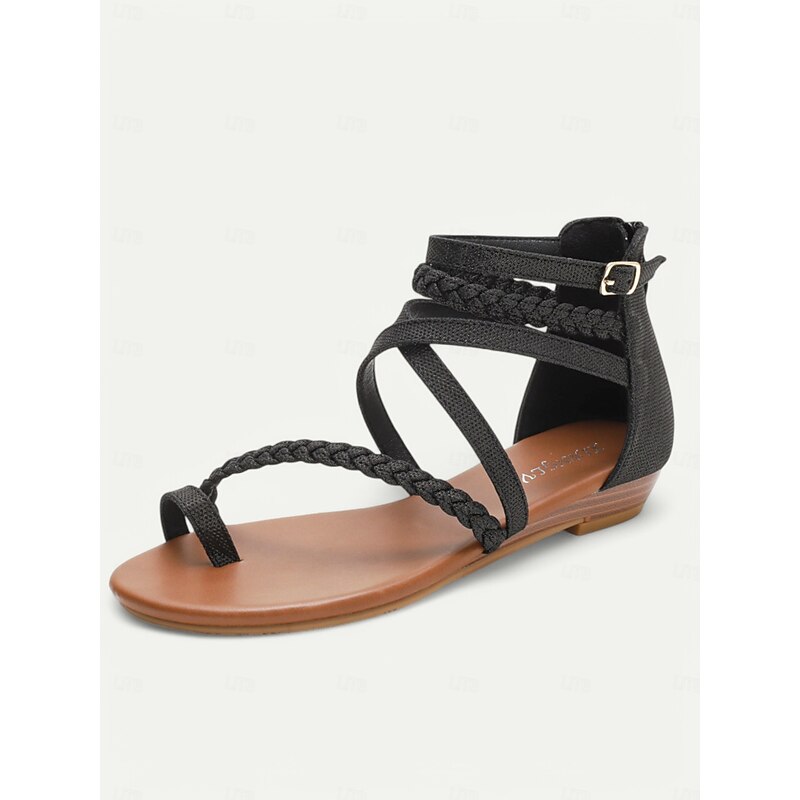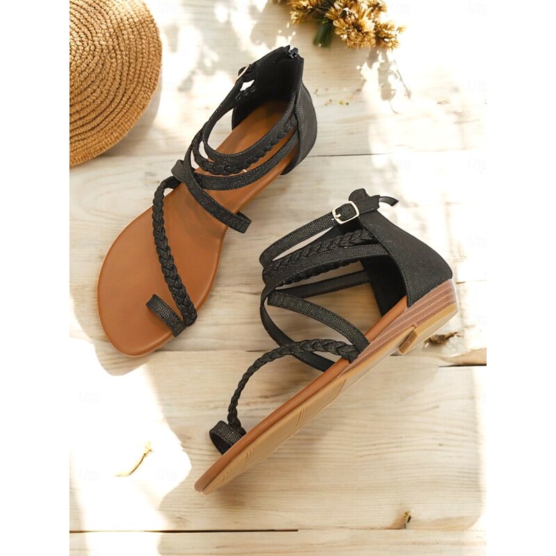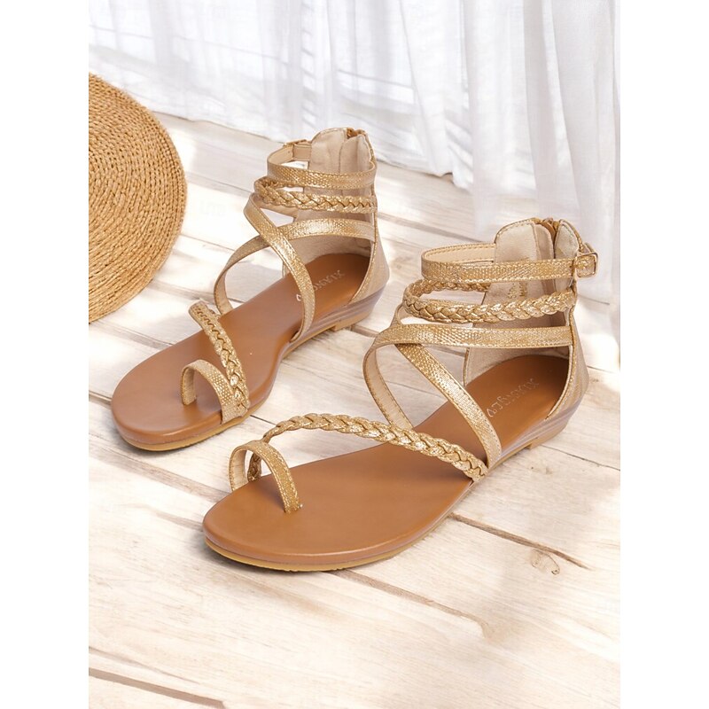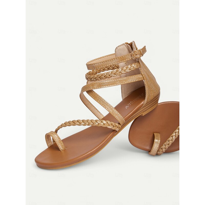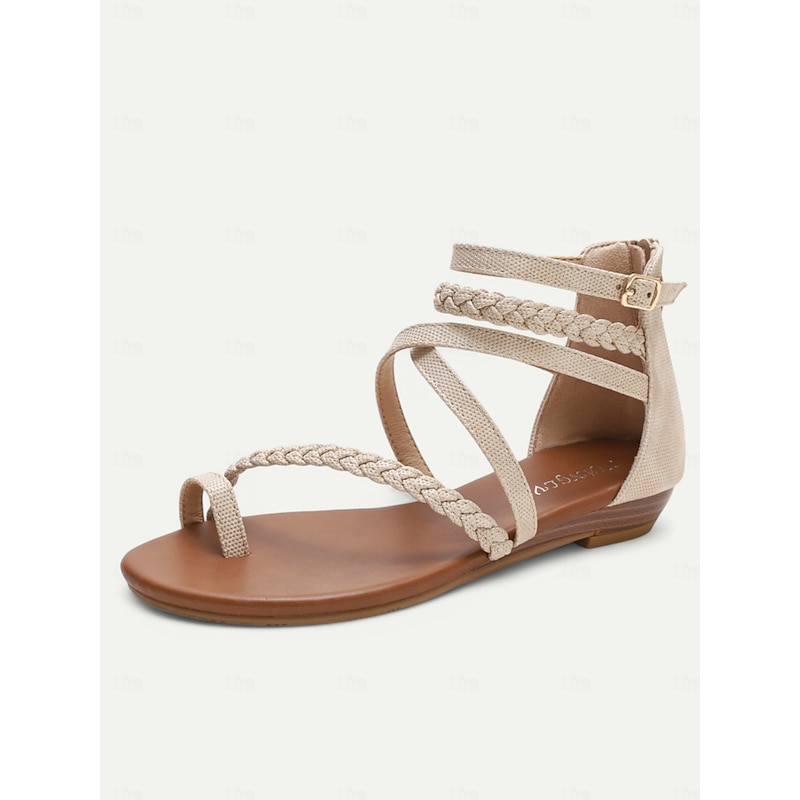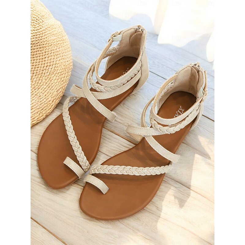 HOT ! Women's Brown Braided Gladiator Flat Sandals – Boho Strappy Toe Ring Sandals for Summer Beach, Casual, and Vacation Wear