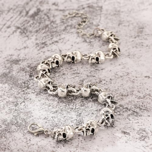 Gothic Silver/Gold Beaded Skull Bracelets for Men Women Punk, Goth Skulls Beads Skeleton Chain Bracelet Halloween Statement Jewelry Gift Accessories 4