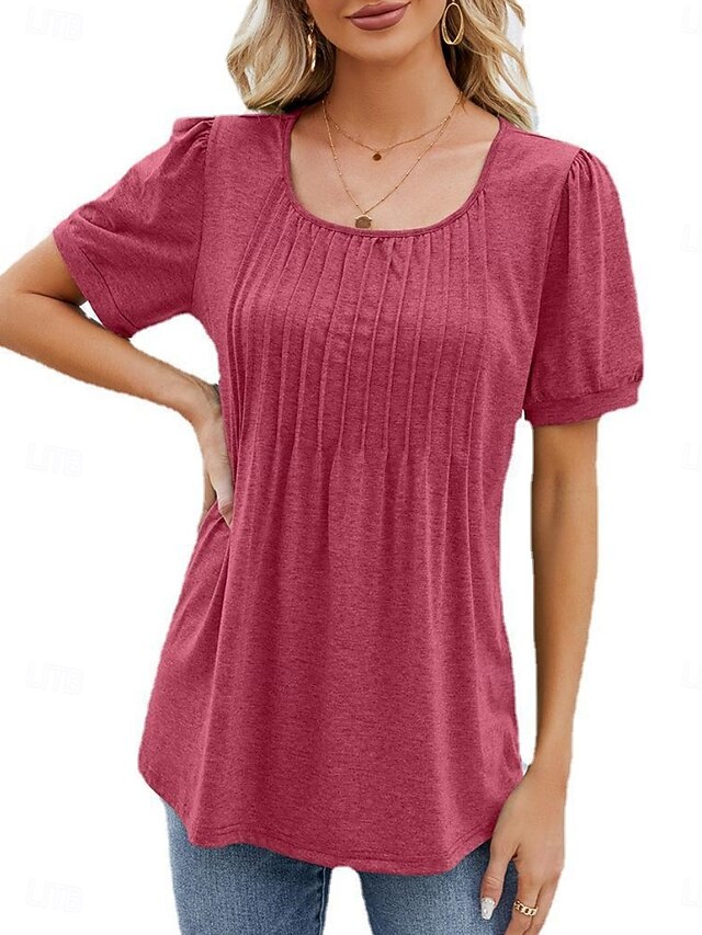 Women's Shirt Blouse Solid Color Basic Casual Short Sleeve Crew Neck Regular Tops Daily Ruched White Wine Navy Blue Summer Spring 15