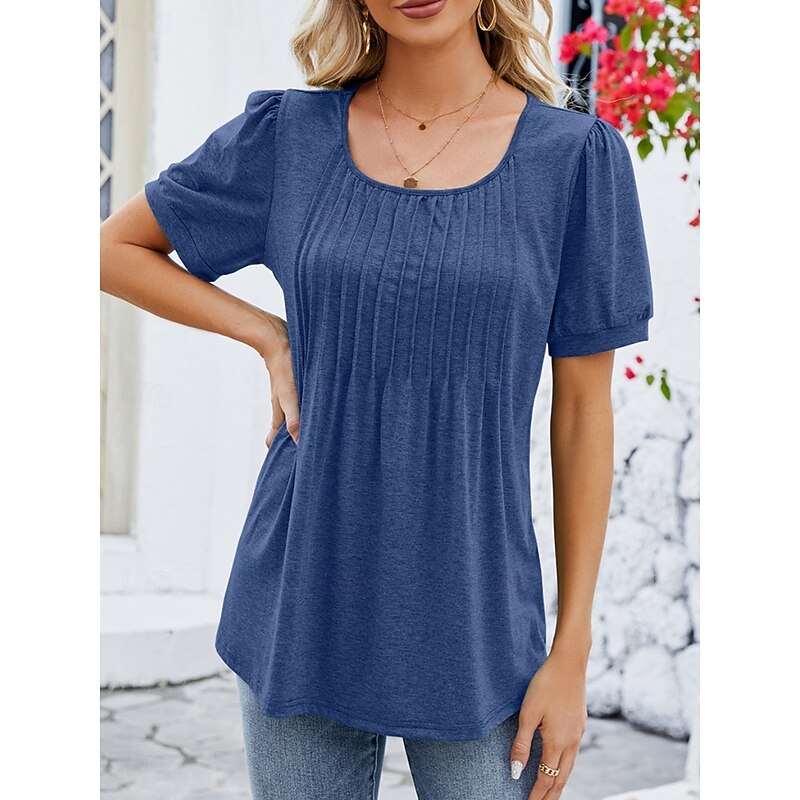 Women's Shirt Blouse Solid Color Basic Casual Short Sleeve Crew Neck Regular Tops Daily Ruched White Wine Navy Blue Summer Spring 7