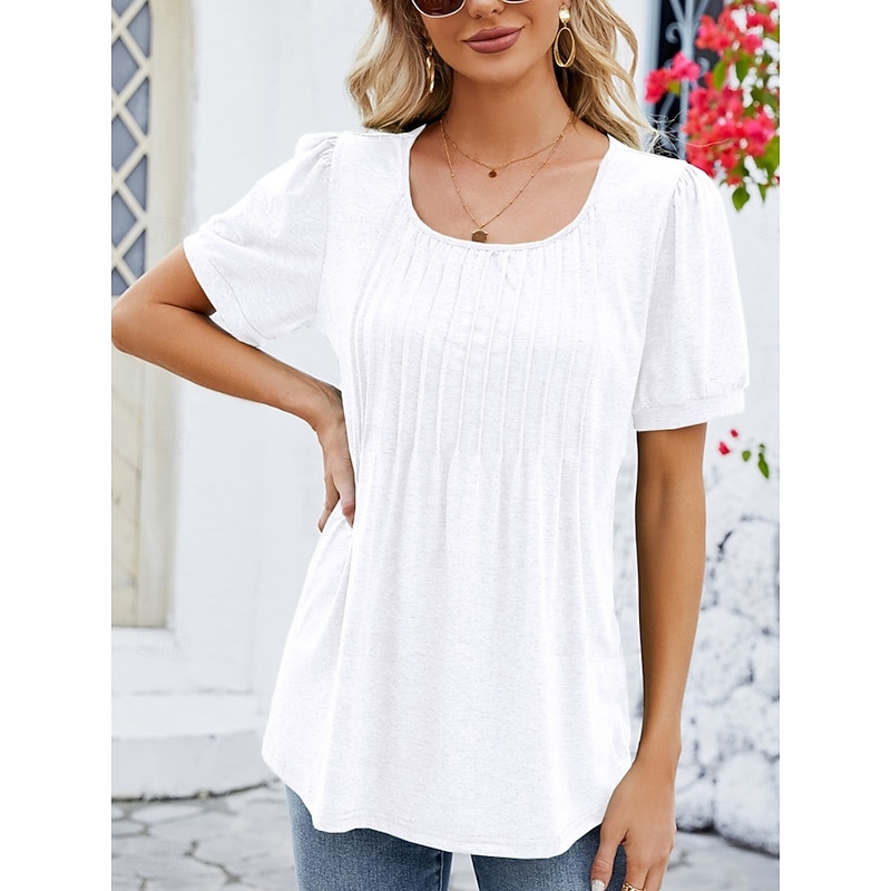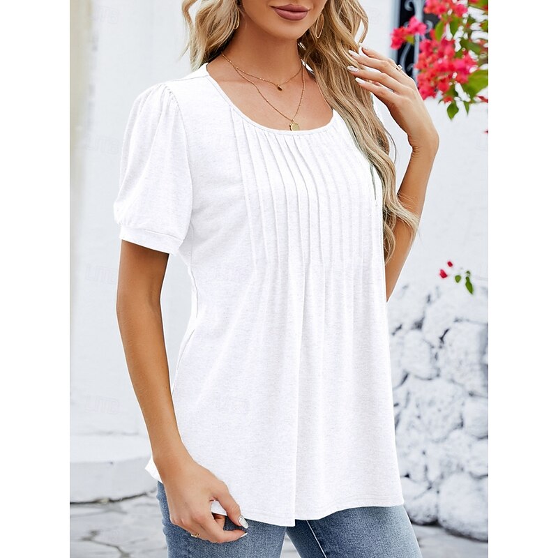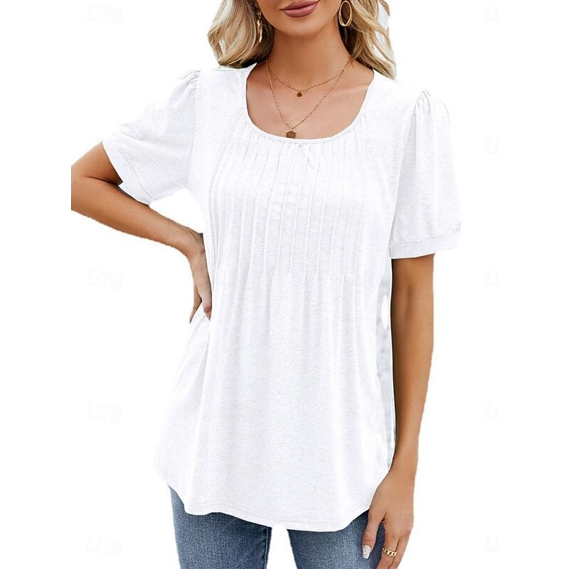Women's Shirt Blouse Solid Color Basic Casual Short Sleeve Crew Neck Regular Tops Daily Ruched White Wine Navy Blue Summer Spring 14