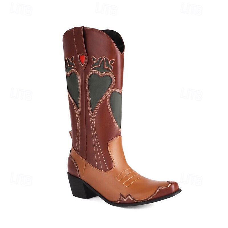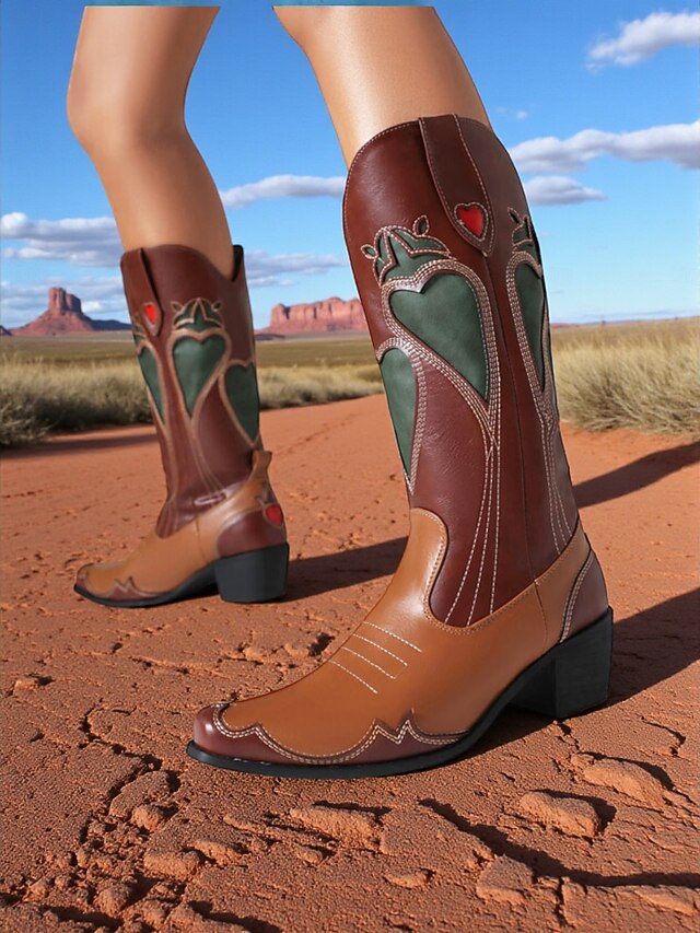 HOT ! Women's Brown & Tan Cowboy Boots with Heart Detailing -Chic Western Style Footwear for Urban Fashion