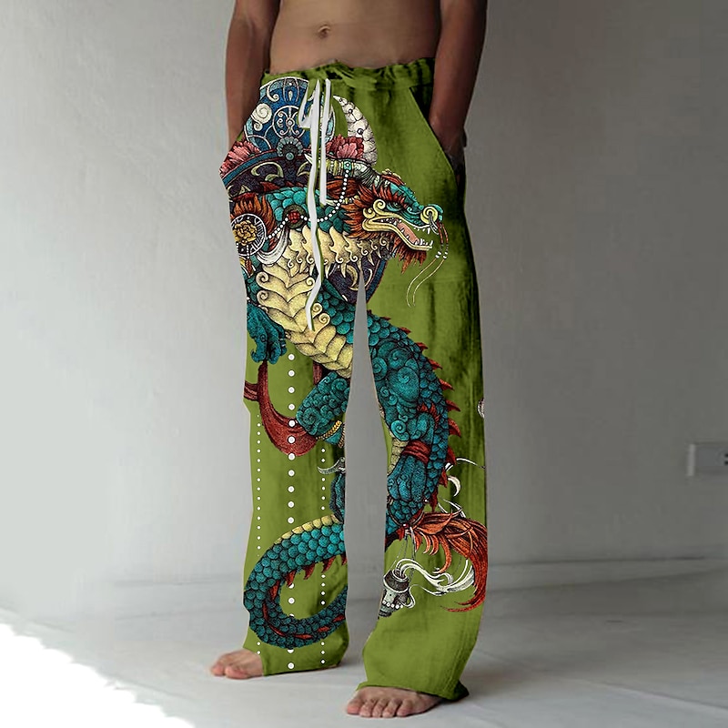 Highlights [Fabric] : Crafted from high-quality polyester, these men's trousers offer a lightweight and breathable experience, perfect for keeping cool during the warm spring and summer seasons. The fabric ensures durability and comfort, making these pants suitable for daily wear. [Fit] : With a regular fit design, these pants provide a relaxed and cushy silhouette. The straight leg cut enhances ease of movement, while the elastic waistband with a drawstring allows for an adjustable and personalized fit. [Design Highlights] : Featuring a striking dragon graphic print against a crisp white background, these trousers present a bold and artistic statement. The front pocket adds practicality, while the drawstring and elastic waist ensure both style and functionality. The vivid color palette and cultural dragon design make these pants a standout addition to any fashion-forward wardrobe. [Occasions] : Ideal for casual outings, daily wear, or relaxed weekends, these trousers are versatile enough to be worn for various spring and summer activities. Whether you're heading to the beach or having a casual day out, these pants add a touch of creativity and flair to your ensemble. [Size Range] : Available in a wide range of sizes to ensure the perfect fit, these trousers offer options from S to 5XL, catering to a diverse set of body types and style preferences. Perfect for everyday use. excellent materials and excellent craftsmanship ensure long-lasting durability.