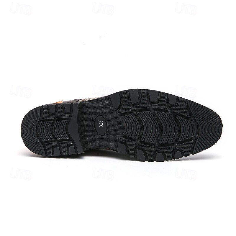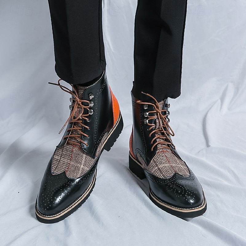 Highlights [Fabric] : Expertly crafted from high-quality PU, these men’s boots boast a durable construction that ensures a polished and long-lasting appearance. The robust outsole made from reliable rubber material offers excellent support and traction, making these boots suitable for different terrains. [Form] : Featuring a classic round toe and ankle boot design, these boots provide a perfect balance of style and comfort. The incorporation of a solid brogue pattern enhances their traditional appeal, while the lace-up closure ensures a snug and secure fit. [Design Highlights] : The boots feature intricate wingtip detailing and skillful splicing of materials that create a sophisticated look. The textured checkered pattern on the sides adds a fashionable contrast, complemented by a striking orange accent on the back that adds a modern twist. [Occasions] : These versatile boots are ideal for various occasions, from formal settings to casual outings. Whether it's a daily walk or a special event, their blend of tradition and contemporary style makes them a standout choice for any occasion. [Size Recommendation] : Available in a range of sizes from US6-6.5 to US12, these boots are designed to fit standard size ranges comfortably, so select your usual size for the best fit.