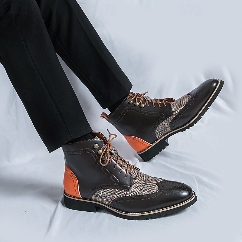 Men's Faux Leather and Plaid Brogue Boots, Vintage Style Lace-Up Ankle Boots with Wingtip Detailing for Formal and Casual Wear 1