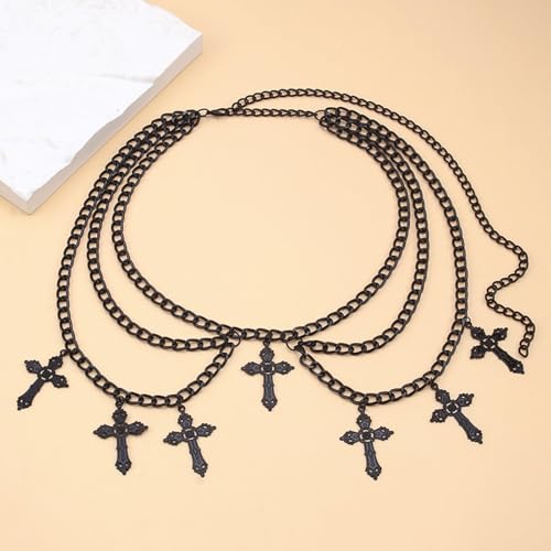 HOT ! Silver Cross Waist Chain Belt for Women Adjustable Black Body Chain Belt Trendy Tassel Cross Belly Chain Belt Long Metal Link Chain Belt Punk Body Jewelry (layered black)
