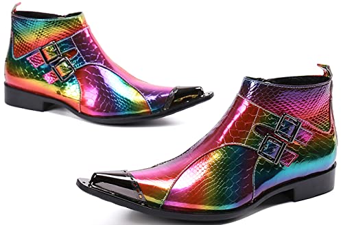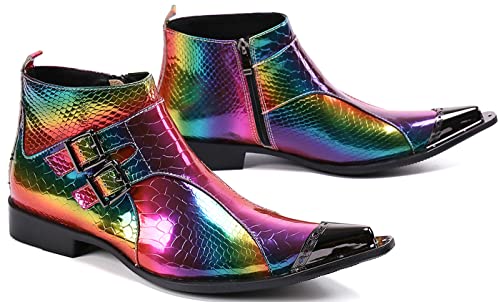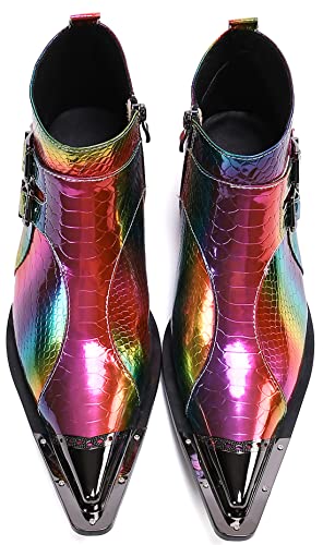 Santimon Mens Dress Casual Rainbow Ankle Chelsea Boots – Genuine Leather Punk Gothic Metal Pointed Toe Double Buckle Party Rock Cowboy Boots for Stage, Clubwear, Disco 6