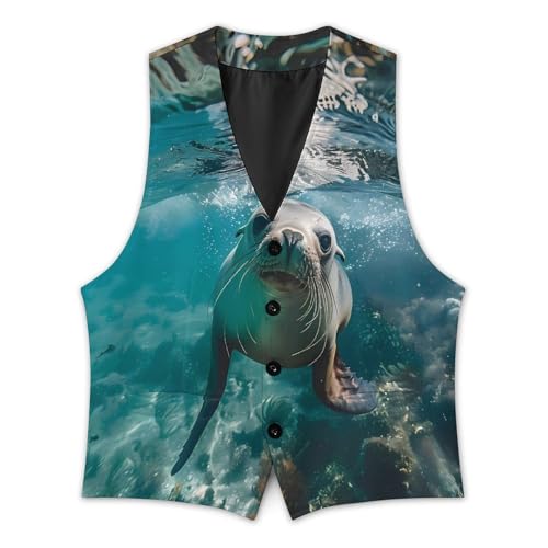 HOT ! Australian Sea Lion Underwater Photo Men's Suit Vest Waistcoat Vests Formal Dress with 2 Pockets for Business Casual Tuxedo