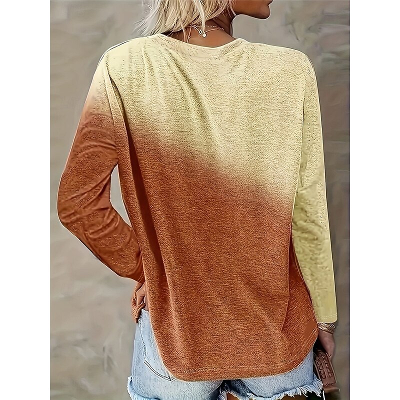 Highlights [Fabric] : Made with a soft polyester blend, this women's long-sleeve T-shirt balances comfort and style, offering micro-elasticity for a flexible fit. The fabric ensures breathability and warmth, making it perfect for transitioning between spring and fall. [Fit] : This top features a regular fit that provides ease of movement while maintaining a flattering silhouette. The relaxed design is complemented by a classic crew neckline, allowing for easy pairing with different bottoms. [Design Highlights] : The T-shirt boasts an abstract ombre pattern with a unique artistic line drawing of a woman's face, adding a contemporary and artistic flair to your wardrobe. The minimalistic design ensures versatility while keeping you on-trend. [Occasions] : Ideal for daily wear, this T-shirt is a great choice for casual outings, relaxed weekends, or any informal gatherings. Its chic yet effortless style makes it easy to wear with jeans or leggings, adding a touch of art to any everyday look. [Size Range] : Available in a wide range of sizes from S to 2XL, this T-shirt offers options for various body types, ensuring a comfortable and stylish fit for everyone.