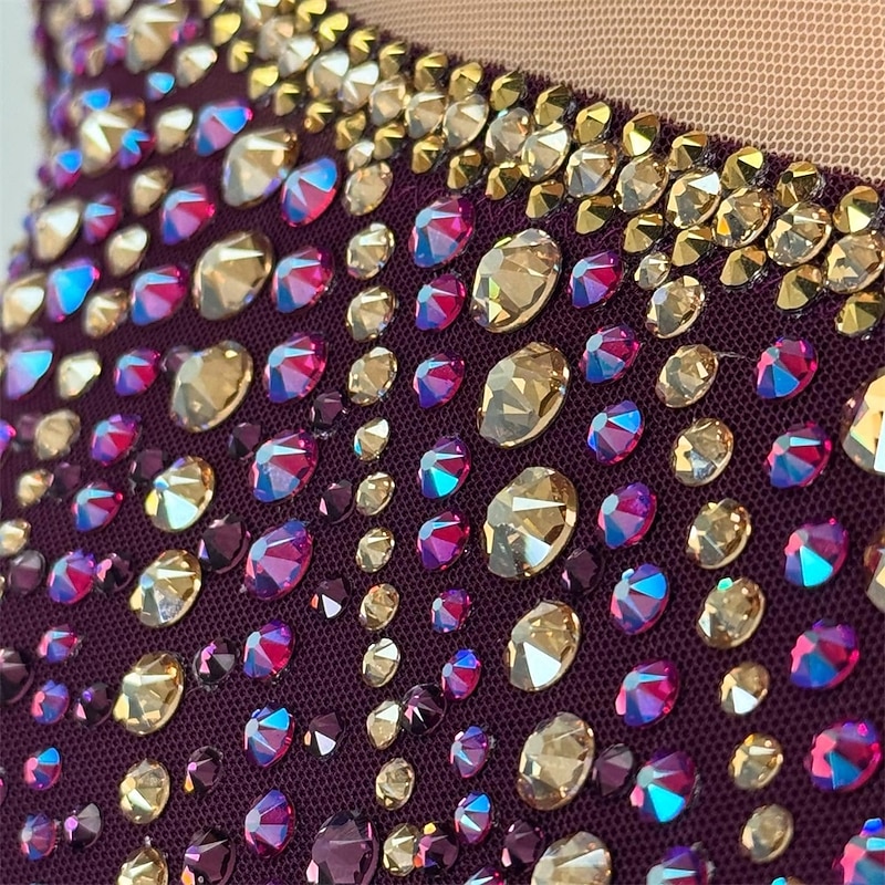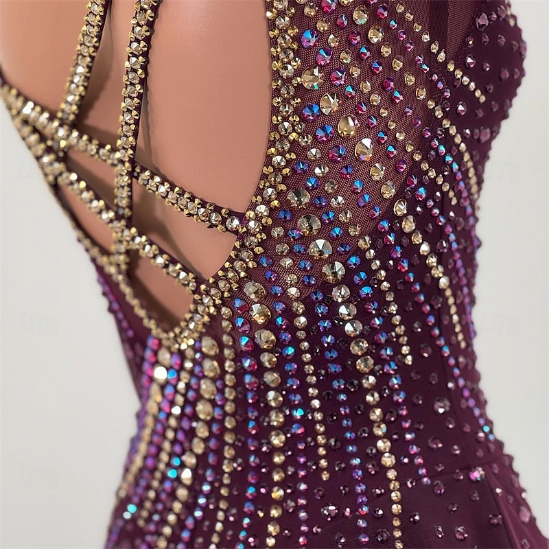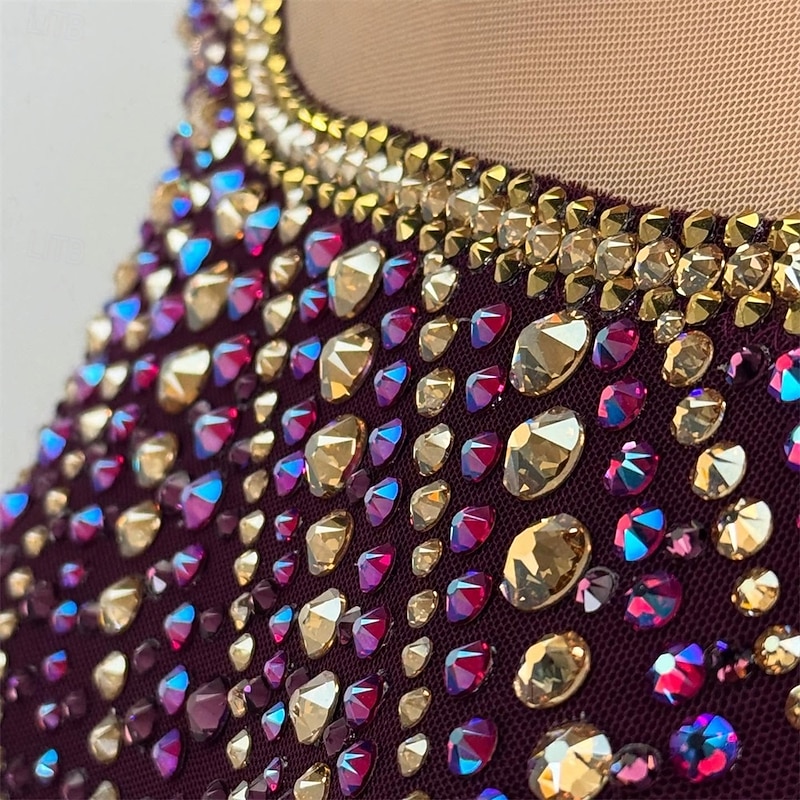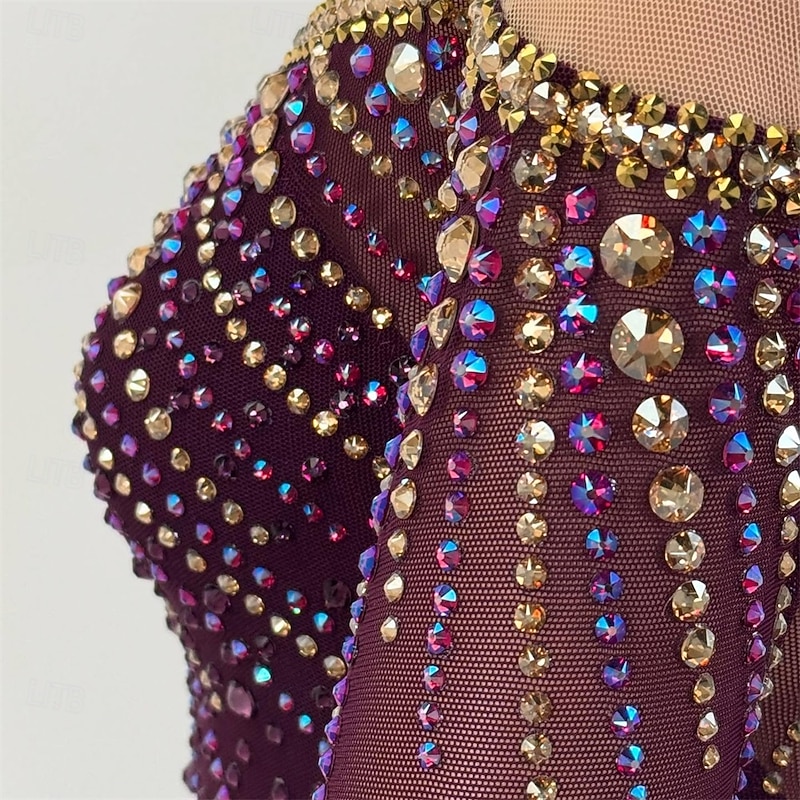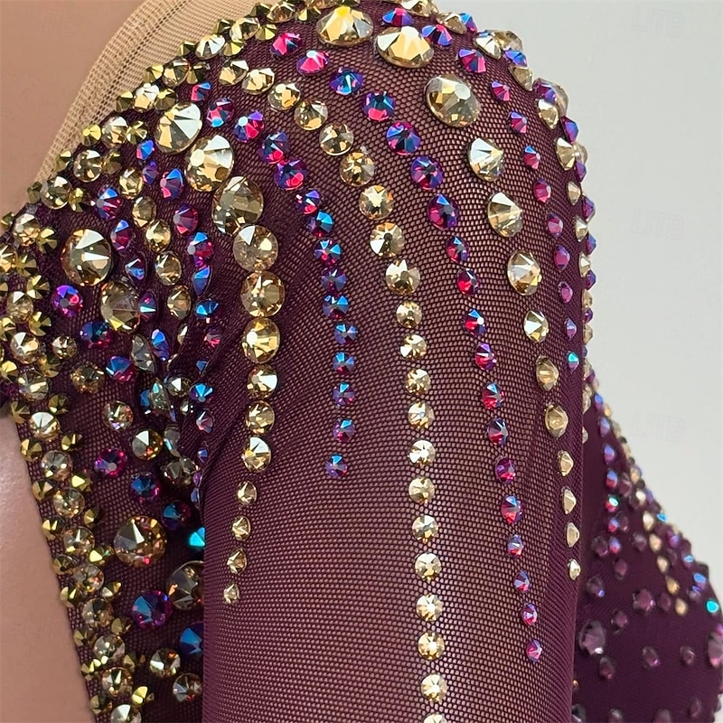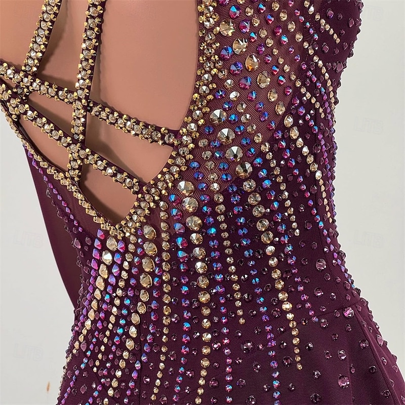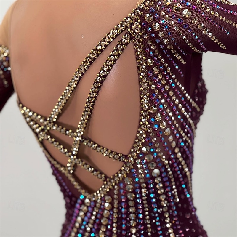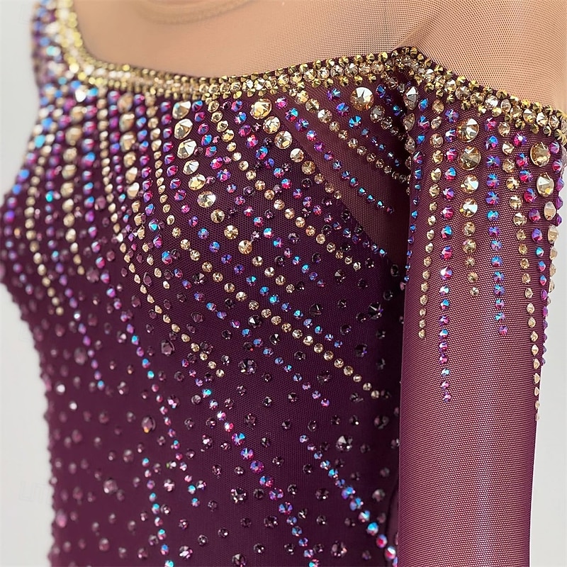 More information about Figure Skating Dress Women's Girls' Ice Skating Dress Burgundy Patchwork Open Back Mesh Spandex High Elasticity Training Competition Skating Wear Classic Crystal / Rhinestone Long Sleeve Ice Skating