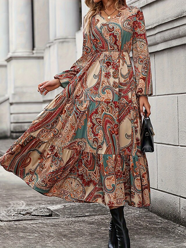 : The dress showcases a vibrant graphic print in warm tones, lending a touch of bohemian flair. It features a modest V-neckline and long sleeves, ideal for transitioning between spring and fall. The tiered, flowing skirt enhances volume, adding a playful, elegant touch.