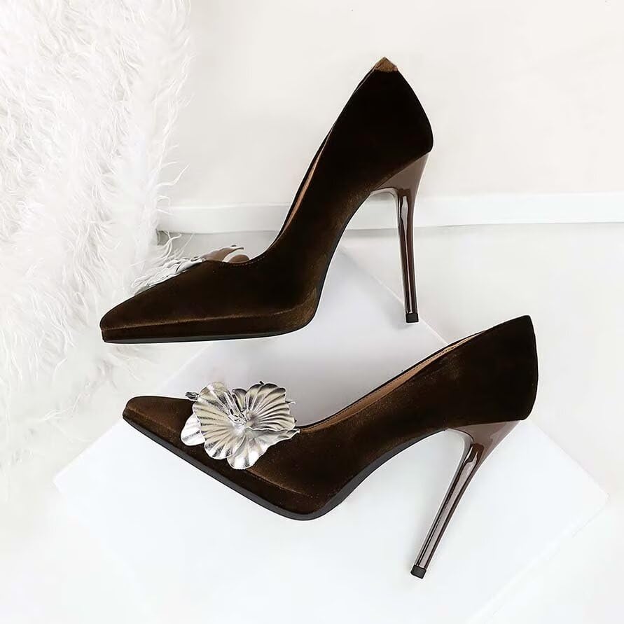 HOT ! JOEupin Women's Pumps Slip On Stiletto Pumps with Metal Flowers Classic Pointed Closed Toe High Heels Elegant Dress Shoes