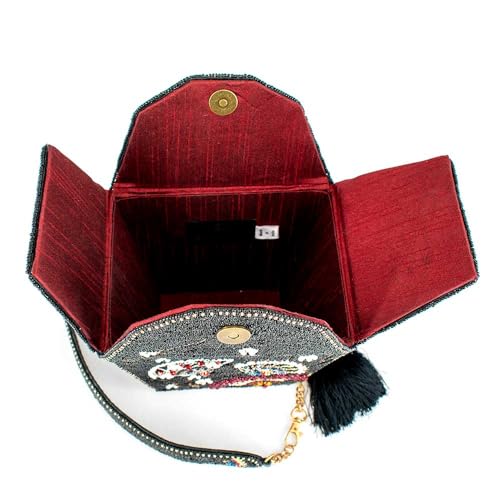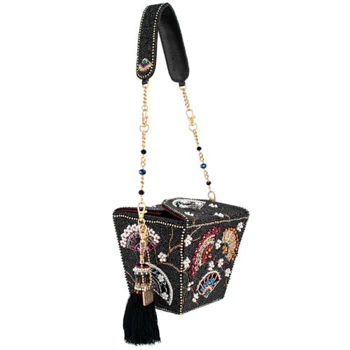 • Unique Statement Design: Inspired by a take-out box, this novelty handbag features embroidered branches and dancing fans, intricately embellished with sparkling beads and pearls for a luxurious, eye-catching look.