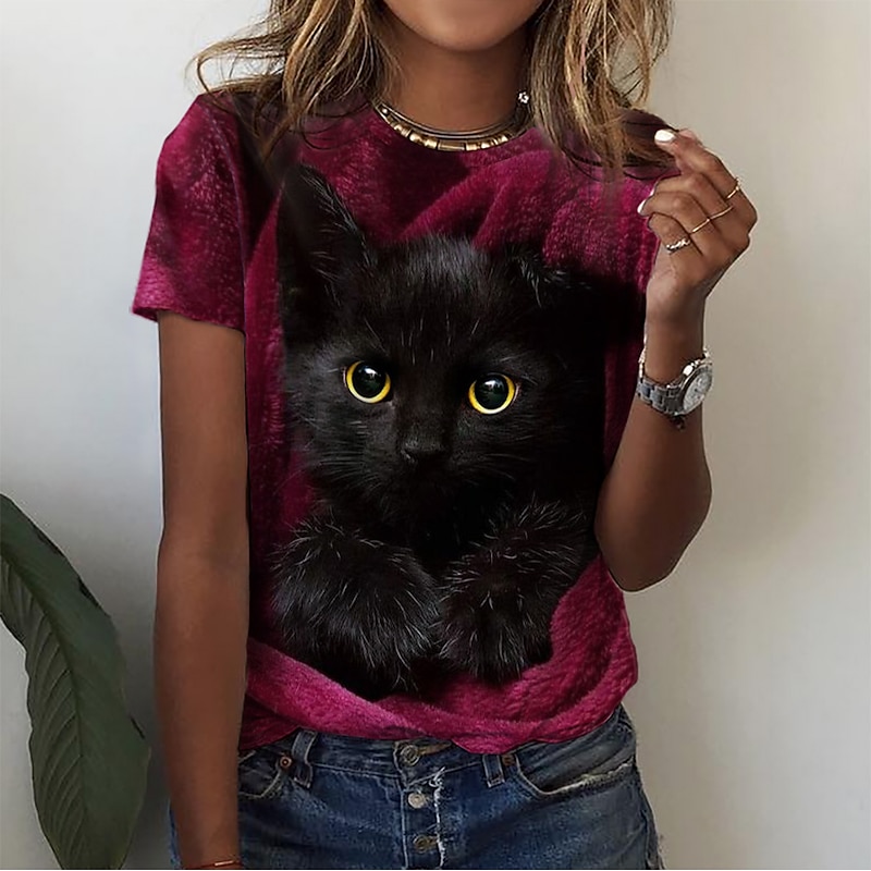 Highlights [Fabric] Crafted from a soft and breathable polyester blend, this women’s T-shirt ensures comfort and ease for all-day wear. The fabric's micro-elastic quality provides a subtle stretch, allowing for a relaxed and comfortable fit. [Fit Type] This T-shirt offers a regular fit with a classic short sleeve design, making it a versatile choice for various casual occasions. The relaxed silhouette is perfect for those seeking comfort without compromising on style. [Design Highlights] Featuring a striking 3D print of a black cat with vivid yellow eyes, this piece stands out with its vibrant and lifelike print. The round neckline enhances its casual chic appeal, while the playful and trendy 3D cat design adds a whimsical touch to any outfit. [Occasions] Ideal for daily wear and weekend outings, this T-shirt fits seamlessly into a variety of casual settings. Whether you're relaxing at home or heading out with friends, its unique design and comfortable fit make it a go-to piece for cat lovers and those looking to add a fun element to their wardrobe. [Size Range] Available in a range of sizes from S to 2XL, this T-shirt caters to a wide audience, ensuring an inclusive fit. The varied color options, including Blue, Green, Red, Gray, and Purple, allow for personal expression and coordination with different styles and preferences.