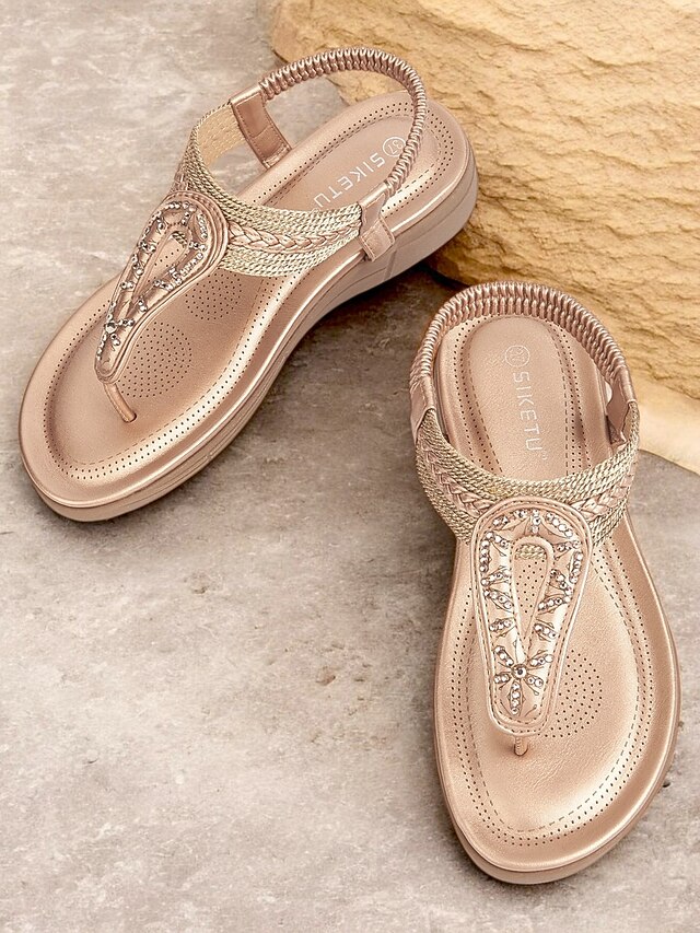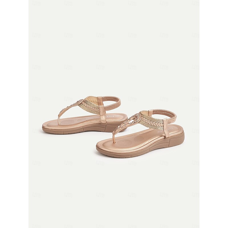 Women's Rhinestone T-Strap Sandals with Braided Detailing, Comfortable Flat Summer Shoes for Casual and Beach Wear 23