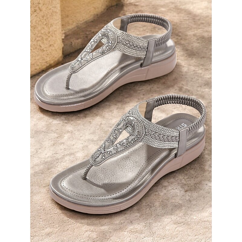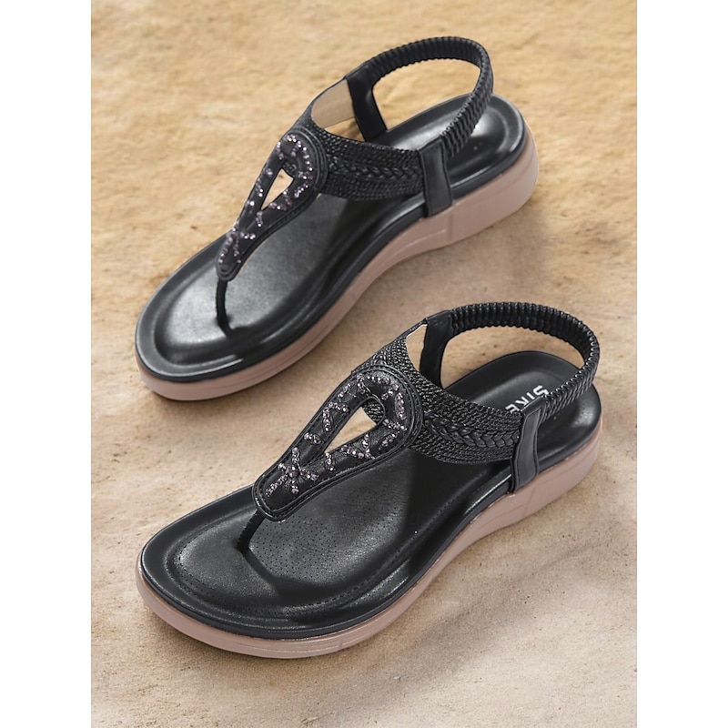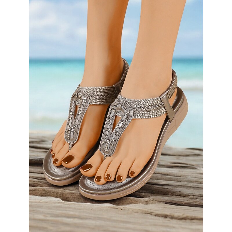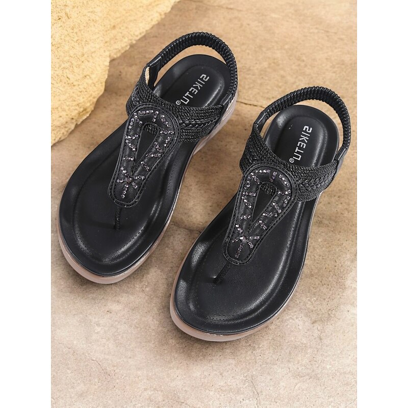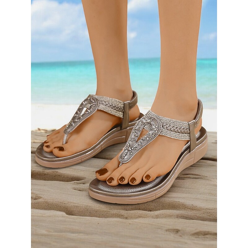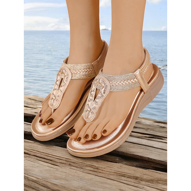 HOT ! Women's Rhinestone T-Strap Sandals with Braided Detailing, Comfortable Flat Summer Shoes for Casual and Beach Wear