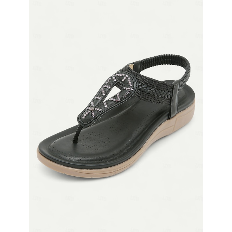 Women's Rhinestone T-Strap Sandals with Braided Detailing, Comfortable Flat Summer Shoes for Casual and Beach Wear 19