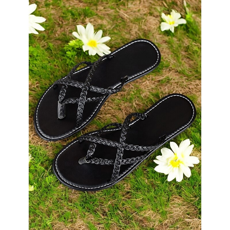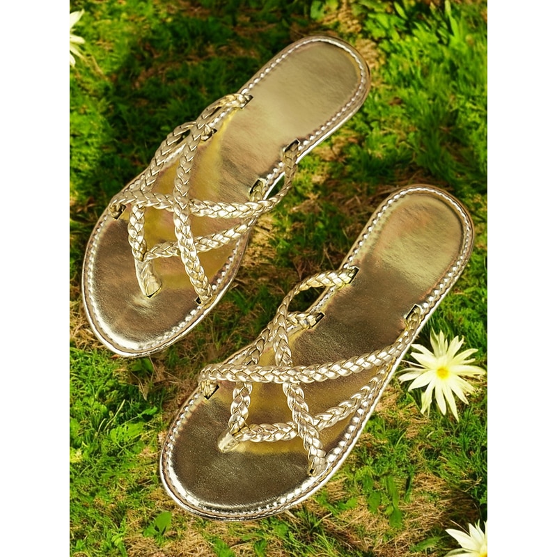 HOT ! Gold Strappy Sandals for Women – Elegant Toe Loop Sandals with Braided Design and Flat Sole for Casual Summer Outfits
